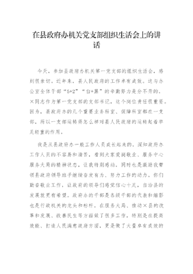 在县政府办机关党支部组织生活会上的讲话今天,参加县政府办机关第一党支部的组织生活会,感到很亲切。近年来,县人民政府的工作卓有成效。这与办公室全体干部5+2白+黑的辛勤努力是分不开的,×同志作为第一党支部的支部书记,这个岗位责任很重要。因为,县政府办的几个重要业务科室、保障科室都在一支部,所以一支部运转得怎么样对县人民政府的运转起着举足轻重的作用。我是从县政府办一般工作人员成长起来的,深知政府办工作人员的不容易和清苦,看到大家爱岗敬业、服务中心服务大局的精神状态,让我特别感动,同时也是激励我带领县政府领导班子继续奋发有为、努力工作的动力。你们勤奋敬业工作,让政府的领导们感觉信心十足,自治县的发展就更有希望。政府办的干部是各级干部的代表和缩影也是行政机关的龙头和标杆,在服务大局、推动×县的改革和发展、改善民生等方面做了很多工作,特别是在提高效能、打造人民满意政府方面,更是做了大量卓有成效的工作。在此,我谨代表县政府党组对各位的辛勤付出表示感谢。刚才,×同志代表一支部作了剖析发言,剖析全面深刻、实事求是,分析问题的原因很中肯、符合实际,提出努力方向和整改措施也很得力。这次的支部组织生活会准备的非常充分,态度非常认真,我觉得只要大家看到了存在的问题,不断的努力解决问题,一支部的凝聚力和战斗力会不断增强,一支部在政府办的重要作用会进一步彰显。希望你们按照提出的整改措施进一步努力,欢迎大家给我多提宝贵意见,同志们之间也要认真开展相互批评,达到不断增进工作、改进工作的目的。借此机会对县政府办及一支部工作提几点希望。一、强化思想引领,做政治上的明白人要强化党建引领,思想上和党中央保持高度统一,认真学习习近平新时代中国特色社会主义思想。习近平新时代中国特色社会主义思想是我们党和国家治国理政的高度概括和总结提炼,是我们工作的方向和基本遵循,县政府办的同志要系统的学、重点的学、联系实际的学。近几年,×省在总书记思想的指引下,在实施创新引领、开放崛起战略中取得了丰硕的成绩,经济增速在全国进入第一方阵成为全国的一道靓丽风景,省里对标对表抓工作的精神给我们做了很好的榜样。所以,我们在工作中,无论是做好民生工作还是推动改革发展,都要对标对表抓实抓好。加强习近平新时代中国特色社会主义思想理论、党中央大政方针、决策部署的学习,是政府从领导到各级公务人员的首要任务,政府办组织的一切学习,都要坚持思想引领,结合实际具体谈。离开了思想引领,工作就会跑偏;思想引领离开了×的实际,就会成虚的,就会犯大的、方向性、颠覆性的错误。比如,在脱贫攻坚工作中,我们个别县就曾犯过急躁病。个别县想早点脱贫,在脱贫攻坚工作中搞了很多自选动作,但规定动作却没搞完。打好脱贫攻坚战主要是解决两不愁、三保障的问题,游离于这个主要问题之外的自选动作,都是跟中央和习总书记的要求不完全一致的,会导致脱贫攻坚事倍而功半。再比如,污染问题、违规建设别墅等这类问题,习总书记多年前提出绿色发展理念,如果有关方面过来严格执行中央的要求,就不会出现矿山污染等问题。这些问题结合到学习来看,看似是学习,实际上是工作的方向把得准不准、目标定得对不对的问题。所以政府各级工作人员一定要加强学习,只有加强学习,头脑清醒,目标明确我们才能行稳致远。办公室工作人员不能只埋头拉车,不抬头看路,要认真学习习近平新时代中国特色社会主义思想,认真研究国家的大政方针和政策,用习近平新时代中国特色社会主义思想武装头脑,真正做到四个自信四个坚定两个维护。二、强化实践历练,做工作上的实干家没有实干就不会有发展,没有发展就不会有进步。县政府办的每一个同志都守好自己的岗位、担起自己的职责,政府办的作用就会发挥好,县人民政府的作用才会发挥好各级党委、政府都发挥好作用,×就很有希望,大有前途。我曾经两度在政府工作,有一些体会和历练,就政府办的班子和干部在实践中的历练提几点要求。一要在实践中拓宽视野。要在服务领导中拓宽视野。比如,文电科×同志,天天做的是传递文件的具体工作,如果把传递文件当成事务性的工作,那就永远得不到提高,永远只是一个传递员;如果拓宽视野,就会从每天传递的文件里、从领导的签批中学到很多,得到进步。再比如,会议科×同志,要把每一次政府常务会、专题会当成一堂实践课,各部门怎么汇报、怎么制定措施,与会同志怎么发言,领导决策的现实依据和政策依据在哪里?认真思考把每一次听会的过程当成一次学习的过程。要把每一次跟领导出差、调研也当成是一次实践课;领导每一次调研是怎么开展的,怎么解决问题的,怎么形成决策意见的,如何推动全县解决共性的问题等,要一边观察、一边总结、一边思考、一边提炼,不断提高,这是政府办的优势。要在实际工作中拓宽视野。县政府办的工作人员参加的重要会议和重大活动多,接触面广,不能满足于履行岗位职责