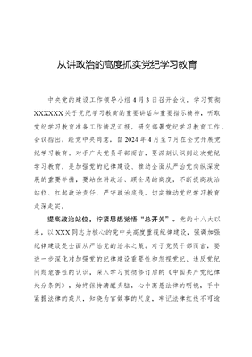 从讲政治的高度抓实党纪学习教育中央党的建设工作领导小组4月3日召开会议,学习贯彻XXXXXX关于党纪学习教育的重要讲话和重要指示精神,听取党纪学习教育准备工作情况汇报,研究部署党纪学习教育工作。会议指出,经党中央同意,自2024年4月至7月在全党开展党纪学习教育。对于广大党员干部而言,要深刻认识到这次党纪学习教育,是加强党的纪律建设、推动全面从严治党向纵深发展的重要举措,要站在讲政治、顾全局的高度,不断提高政治站位、扛起政治责任、严守政治底线,切实推动党纪学习教育走深走实。提高政治站位,拧紧思想觉悟总开关。党的十八大以来,以XXX同志为核心的党中央高度重视纪律建设,强调加强纪律建设是全面从严治党的治本之策。对于党员干部而言,要进一步深化对加强党的纪律建设重要性和忽视党纪、违反党纪问题危害性的认识,深入学习贯彻修订后的《中国共产党纪律处分条例》,始终保持清醒头脑,心中高悬法律的明镜,手中紧握法律的戒尺,知晓为官做事的尺度,牢记法律红线不可逾越、法律底线不可触碰,在思想意识深处设置一道底线、划出一条红线、标明一片雷区,做到思而出乎理智、做而有所顾忌、行而不忘法纪,始终做政治上的明白人、工作生活上的清白人。扛起政治责任,激发担当作为新动能。制度的生命力在于执行,有制度不执行,比没有制度危害还要大。制度一经形成,就要严格遵守,坚持制度面前人人平等、执行制度没有例外。广大党员干部要强化责任意识,带头执行和维护法规制度,把党纪国法、制度规矩作为行动的标尺,严格按照法定职责、法定权限、法定程序,公开透明地履行职责,确保权力在阳光下运行。坚持担当为要,实干为先,不搞花架子、喊空口号,做锐意进取、奋发有为、关键时顶得住的干部,面对大是大非敢于亮剑,面对矛盾敢于迎难而上,面对危机敢于挺身而出,以更大的勇气智慧、更强的意志品德、更优的工作成绩,不负党和人民的殷切期望。严守政治底线,筑好廉洁从政防火墙。面对世界百年未有之大变局,我们党对新时期的工作提出了更多的新要求,作为新时代的党员干部,要把人民群众满不满意作为评判党纪学习教育成效的根本标准,不断淬炼党性觉悟,始终坚持全心全意为人民服务的根本宗旨,自觉在思想上织密防护网、文可居文库——海量学习资料,手机电脑均可下载www.wenkeju.com筑牢防火墙,涵养大公无私、公私分明、先公后私、公而忘私的精神境界,筑牢拒腐防变堤坝,从源头上抵制贪腐之念的侵袭。用实际行动凸显出公心,察民情、接地气,倾听群众呼声,反映群众诉求,用公心凝聚更多更大的民心,进而为实现中华民族伟大复兴的中国梦而奋斗。文可居文库——海量学习资料,手机电脑均可下载www.wenkeju.com