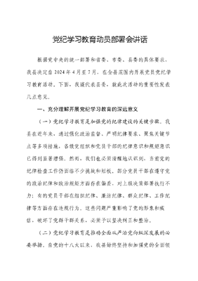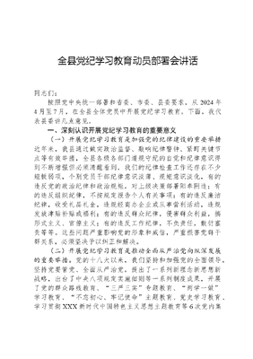 全县党纪学习教育动员部署会讲话同志们:按照党中央统一部署和省委、市委、县委要求,从2024年4月至7月,在全县全体党员中开展党纪学习教育。下面,我代表县委讲几点意见。一、深刻认识开展党纪学习教育的重要意义(一)开展党纪学习教育是加强党的纪律建设的重要举措近年来,我县通过做实政治监督、敲响纪律警钟、紧盯关键节点等有效举措,全县各级各部门遵规守纪的自觉和纪律意识得到不断增强但必须清醒看到,我们的纪律检查工作还存在不少短板弱项,个别党员干部纪律意识淡薄、规矩意识淡化,有的违反党的政治纪律和政治规矩,对上级决策部署阳奉阴违;有的违反组织纪律,不按规定报告个人有关事项;有的违反廉洁纪律,收受礼品礼金,违规经商办企业或从事营利活动,违规发放津贴补贴或福利;有的违反群众纪律,侵害群众利益,搞形式主义、官僚主义;有的违反工作纪律,不负责任,敷衍塞责等等。这些问题严重影响党的形象和威信,严重损害党群干群关系,必须坚决予以纠正和解决。(二)开展党纪学习教育是推动全面从严治党向纵深发展的重要举措。党的十八大以来,我们坚持和加强党的全面领导,坚持党要管党、全面从严治党,提出了一系列新理念新思想新战略,出台了中央八项规定实施细则等一系列制度成果,开展了党的群众路线教育、三严三实专题教育、两学一做学习教育、不忘初心、牢记使命主题教育、党史学习教育、学习贯彻XXX新时代中国特色主义思想主题教育等6次党内集中学习教育,全县各级党组织和广大党员干部的理论素养、精神状态、能力本领明显提升。同时必须看到,一些重点领域腐败问题时有发生;一些党组织和党员领导干部主体责任意识淡薄;一些党组织管党治党不力;一些纪检监察干部执纪审查能力欠缺等等。这些问题如果任由发展蔓延,后果不堪设想。(三)开展党纪学习教育是巩固拓展主题教育成果的重要举措。通过扎实开展学习贯彻XXX新时代中国特色主义思想主题教育,全县广大党员干部受到了一次全面深刻的政治教育、思想淬炼、精神洗礼,坚定了对马克思主义的信仰,增强了四个意识、坚定了四个自信、做到两个维护。但是一些党员干部的学习热情有所消退、学习效果有所减弱。有的认为党史学习教育已经结束,学习动力不足;有的认为取得的成绩已经很多了,不想再往前走了;有的缺乏学习的兴趣和热情。这些都是需要我们关注的问题。开展党纪学习教育,就是要引导广大党员干部自觉用党规党纪校正思想和行动,真正使学习党纪的过程成为增强纪律意识、提高党性修养的过程,切实把学习成效转化为推动高质量发展的强大力量。二、准确把握开展党纪学习教育的目标任务这次党纪学习教育从2024年4月开始到7月结束。总体要求是:坚持学思用贯通、知信行统一,把理论学习与解决问题结合起来,把警示教育与日常监督结合起来;坚持抓严抓实、以案促改,强化对权力运行的制约监督;坚持领导带头、以上率下,层层压实责任;坚持统筹兼顾、守正创新,做到主题鲜明、内容丰富、形式多样、节奏紧凑。主要任务:突出政治监督这个根本任务;突出作风建设这个重要内容;突出标本兼治这个基本方针;突出重点对象这个关键着力点;突出清廉文化这个显著特色;围绕上述要求重点抓好5个方面内容:一是突出政治监督,督促党员干部把两个维护落实到行动上。二是突出作风建设,引导党员干部树立正确政绩观。三是突出标本兼治,一体推进不敢腐不能腐不文可居文库——海量学习资料,手机电脑均可下载www.wenkeju.com想腐。四是突出重点对象,着力解决群众身边腐败和不正之风突出问题。五是突出清廉文化,营造崇尚廉洁的良好氛围。三、明确开展党纪学习教育的重点任务(一)抓好学习教育。党委(党组)理论学习中心组要发挥示范带动作用,运用集体研讨、邀请专家授课等方式进行深入学习讨论。各基层党组织要结合实际制定学习计划和具体安排。广大党员干部要原原本本读原著、学原文、悟原理,全面系统掌握基本观点、科学体系和丰富内涵。通过多种方式方法加强党章学习和党规党纪学习教育。组织开展对党章、《关于新形势下党内政治生活的若干准则》《中国共产党纪律处分条例》等法规的学习培训。充分发挥各类媒体的作用,大力宣传党章党规党纪和典型案例。(二)抓好警示教育。要深入学习贯彻落实《中国共产党章程》和《中国共产党纪律处分条例》,把纪律挺在前面筑牢拒腐防变防线。要通过多种方式方法配合开展好廉政教育月活动和警示教育月活动。组织召开警示教育大会,通报典型案例进行深入剖析,并组织观看警示教育片《零容忍》之《永远吹冲锋号》。组织党员干部参观县廉政警示教育基地,接受警示教育并观看警示教育片《零容忍》之《永远吹冲锋号》。用身边事教育身边人,警醒干部职工自重自省自律慎独慎微。充分发挥反面典型的警示教育和震慑作用,以案为戒、以案示警,警钟长鸣常敲常想。(三)抓好廉政谈话。各级党组织要切实履行好主体责任