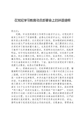 在党纪学习教育动员部署会上的讲话提纲同志们:近期,中央党的建设工作领导小组召开会议,对党纪学习教育工作进行了安排部署,省委也及时召开会议,对党纪学习教育提出具体要求。这次党纪学习教育,是加强党的纪律建设、推动全面从严治党向纵深发展的重要举措。我们要深刻认识此次党纪学习教育的重大意义,尤其是党员干部,要通过此次学习教育不仅弄清楚党纪的要求,更要明白违反的代价,把账算明白,有针对性地剖析反思,解决自身的问题,切实提升自律能力,树立正确权力观,做到公正用权、依法用权、为民用权、廉洁用权,永葆清正廉洁的政治本色。刚才,我们传达学习了中央及省委的相关工作要求,下面,就如何抓好党纪学习教育,我提几点要求,也是动员部署讲话。第一,提高政治站位,把纪律建设摆在更加突出位置,增强遵规守纪的高度自觉。XXXXXX在二十届中央纪委三次全会上强调,以学习贯彻新修订的纪律处分条例为契机,在全党开展一次集中性纪律教育。并多次就开展党纪学习教育发表重要讲话、作出重要指示,为开展党纪学习教育提供了重要遵循。我们要深入学习贯彻XXXXXX的重要讲话和重要指示精神,落实《关于在全党开展党纪学习教育的通知》要求,深刻领悟两个确立的决定性意义,坚决做到两个维护,切实把思想和行动统一到党中央决策部署上来。要把纪律建设摆在更加突出位置,充分发挥纪律建设标本兼治的利器作用,以严的基调深化党纪教育,推动党员干部切实养成纪律自觉。首先,要明白遵守党规党纪是依法行政的前提。实现善治,管理者或执法者必须依靠法治,做到有法必依、执法必严、违法必究,才能切实保障公共安全和人民的合法权益。党员干部是人民的先锋模范,抓好党员干部学习的教育管理、加强党员行为规范化管理,才能促进党性的提升,才能成为一名合格的共产党员。要通过学习,自觉规范言行,正确运用手中的权利,让廉洁自律、自我约束成为基本准则与工作常态,堂堂正正做人,勤勤恳恳做事、清清白白做官,从而赢得人民群众的支持和爱戴。其次,要明白心中有戒才能行为有界。纪律处分条例是规范党组织和党员行为的基础性法规。坚决捍卫两个确立、做到两个维护,进一步严明党的政治纪律和政治规矩,带动各项纪律全面从严,不断增强自我净化、自我完善、自我革新、自我提高能力。开展党纪学习教育,就是督促引导党员干部学纪、知纪、明纪、守纪,纠正一些党员干部对党规党纪不上心、不掌握、不执行等问题,增强纪律意识,养成纪律自觉。每个党员干部都要把党规党纪牢记在心,把纪律当成自己内心之中牢不可破的戒律,唯有心中有戒,方能做到行而有界。最后,要明白坚守底线是保持忠诚的根本。理想信念就是共产党人精神上的钙,没有理想信念,理想信念不坚定,精神上就会缺钙,就会得软骨病。理想信念是总开关,是共产党员的精神支柱,也是廉洁自律的根本。加强教育学习,全面夯实党员干部廉洁自律的阵地,真正在思想上筑起不触犯法律红线的钢铁长城,在权利、金钱和名利面前不丧志、不失节、不折腰,自觉坚守共产党人的精神高地。对照党章党规党纪的要求,从小处着力、抓早抓小,该补的补,该改的改,该巩固的及时强化到位,通过党纪学习不断检视自己,不断自我革命,提升忠诚干净担当的成色。第二,抓住学习重点,用党规党纪校正思想和行动,保持一尘不染的品格操守。党的纪律规矩虽然都是白纸黑字,写得清清楚楚,但要真正把纪律规矩内化于心、外化于行,绝不是那么容易的事情。学习贯彻《中国共产党纪律处分条例》,要文可居文库——海量学习资料,手机电脑均可下载www.wenkeju.com抓住学习重点,坚持逐章逐条学、联系实际学,抓好以案促学、以训助学,准确掌握其主旨要义和规定要求,进一步明确日常言行的衡量标尺,用党规党纪校正思想和行动,真正使学习党纪的过程成为增强纪律意识、提高党性修养的过程。不仅要详读细看,认认真真地学习新修订的《中国共产党纪律处分条例》,还要对纪律心存敬畏,从内心上、思想上要把纪律规矩看成是高压线,树立碰不得、摸不得的意识。要创新学习方式,将日常学习与党性教育、纪律教育相结合,引导党员干部从思想上正本清源、固本培元,牢固树立正确的世界观、权力观、事业观。深入开展警示教育,坚持正面引导和反面警示相结合,运用典型事例和身边人身边事开展沉浸式教育,让党员干部既能学有榜样、又能引以为戒,推动党员干部把他律要求转化为内在追求,不断增强遵规守纪的政治自觉、思想自觉、行动自觉。要时刻保持党纪意识,加强自我约束,提升道德境界,追求高尚情操,远离低级趣味。严格遵守党纪制度,自觉地按照党纪约束自己。对党纪国法心存敬畏,严格执行,丝毫不能懈怠,时时做到慎独、慎微、慎欲。牢牢守住党纪防线,做到自我净化,坚持警钟长鸣,切实抵制诱惑、守住小节,做好表率。自觉接受监督,广泛听取意见,积极开展批评与自我批评,谦