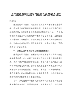 全市纪检系统党纪学习教育动员部署会讲话同志们:开展党纪学习教育,是贯彻落实党中央决策部署的重要举措,是加强党的纪律建设的重要内容,也是推动全面从严治党向纵深发展、巩固拓展党史学习教育成果的实际行动。4月8日,市委刘书记对全市开展党纪学习教育作了全面部署,为做好这项工作提供了明确要求。各级纪检监察机关要切实提高政治站位,坚决扛起政治责任,强化使命担当,认真抓好落实。下面,我讲3个方面的意见。一、深刻认识开展党纪学习教育的重要意义开展党纪学习教育,有利于进一步把思想和行动统一到党中央决策部署上来,有利于推进新时代纪检监察工作高质量发展,有利于以严明的纪律管党治党,营造风清气正的政治生态和干事创业的良好环境。全市各级纪检监察机关要充分认识开展党纪学习教育的重要性、必要性、紧迫性,切实增强做好工作的责任感、使命感和紧迫感,认真履职尽责、主动担当作为,确保党纪学习教育各项任务落到实处。(一)开展党纪学习教育是推进新时代纪检监察工作高质量发展的内在要求。治国必先治党,治党务必从严。纪检监察机关作为党内监督和国家监察专责机关,要找准职责定位,全面履行党章赋予的职能职责,协助党委抓好全面从严治党。有利于督促各级党组织管党治党主体责任落实到位,推动管党治党从宽松软走向严紧硬;有利于推动纪检监察干部强化自我监督、严格自我约束,打造政治素质高、忠诚干净担当、专业化能力强、敢于善于斗争的纪检监察铁军。(二)开展党纪学习教育是落实全面从严治党战略方针的必然要求。近年来,我们认真贯彻中央要求,坚持不懈纠四风、转作风,一体推进不敢腐、不能腐、不想腐,全市党风廉政建设和反腐败斗争形势总体稳中向好。但也要看到,一些重点领域、重要岗位特别是关键少数腐败问题仍然易发多发;一些党组织管党治党不力、四风问题反弹回潮;一些党员领导干部纪律规矩意识淡薄甚至顶风违纪违法等问题还比较突出。这些问题都警示我们,全面从严治党永远在路上,决不能有松口气、歇歇脚的想法。深入开展党纪学习教育,就是要通过持续不断的宣传教育,引导各级党组织和党员领导干部保持清醒头脑,切实增强贯彻落实全面从严治党战略方针的思想自觉和行动自觉;就是要着力解决突出问题,坚决遏制腐败滋生蔓延势头,巩固反腐败斗争压倒性胜利;就是要不断巩固和发展反腐败斗争压倒性胜利,推动全面从严治党取得新的更文可居文库——海量学习资料,手机电脑均可下载www.wenkeju.com大成果。(三)开展党纪学习教育是一体推进不敢腐、不能腐、不想腐的有力抓手。不敢腐、不能腐、不想腐是相互贯通的整体。不敢腐是最根本的、前提性的条件;不能腐、不想腐是从源头上防止腐败的根本途径。开展党纪学习教育,就是要坚持惩前毖后、治病救人的方针,用严明的纪律管全党治全党;就是要加强理想信念宗旨和党性教育,培育积极健康的道德情操;就是要加强廉洁自律意识和拒腐防变能力养成;就是要强化党的领导和监督作用,使广大党员干部心有所畏、言有所戒、行有所止。只有这样才能打通不敢腐、不能腐、不想腐三者内在联系的有效机制,真正实现不敢腐、不能腐、不想腐统筹联动、同向发力。(四)开展党纪学习教育是锻造忠诚干净担当的高素质专业化干部队伍的重要举措。打铁必须自身硬。就是要聚焦关键少数,着力解决政治意识不强、责任担当缺位等突出问题;就是要紧密结合当前正在做的事情来开展学习教育实践锻炼,不断提高发现问题能力、线索处置能力和案件突破能力;就是要注重在反腐败斗争一线识别考验干部,对表现突出的及时大胆使用。总之,通过深入开展党纪学习教育锤炼过硬作风、锻造过硬队伍,必将为新时代纪检监察工作高质量发展提供坚强保文可居文库——海量学习资料,手机电脑均可下载www.wenkeju.com证。二、准确把握开展党纪学习教育的重点任务按照党中央和省委、市委的部署要求,这次党纪学习教育从今年4月开始,到6月底基本结束,总的安排是学习教育查纠整改、总结提升三个步骤环环相扣、步步深入。我们要准确把握重点任务,坚持学思用贯通、知信行统一,切实把各项工作抓细抓实抓到位。一要突出学这个基础。要带着感情学。要把政治标准摆在第一位,真学才能真懂、真信才能真用。要融会贯通学。要加强党章的学习,尊崇党章、遵守党章、贯彻党章、维护党章。要创新方式学。采取理论辅导、专题研讨、听+看+读+写等方式,组织开展内容丰富、形式多样的学习活动,激发党员干部学习热情。二要抓住严这个关键。我们要把监督推动各级党组织及其负责人履行主体责任作为重中之重的任务紧抓不放,聚焦违规吃喝歪风变异回潮问题精准施治、四风问题隐形变异问题防微杜渐、享乐奢靡势头有效遏制等重点任务,加大查处和通报曝光力度;要紧盯群众反映强烈的问题深挖彻查、决不放过。要把严的要求贯彻到监督执纪执法全过程各方面,严