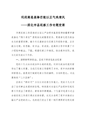 利剑高悬展锋芒敢以正气唤清风——深化市县巡察工作专题党课开展巡察工作是推动全面从严治党向基层延伸的重要举措是推动两个责任落到实处的重要抓手,更是净化党内政治生态的重要保障。就今天在座的各位巡察工作经验丰富、业务能力过硬,有思路、有方法、有成效,在具体工作中积累了不少经验和做法。下面,根据巡察工作情况,结合我市实际,我与大家交流以下内容。一、旗帜鲜明讲政治,坚定不移深化政治巡察党的十九大站在政治和全局的高度,对深化政治巡视巡察作出了重大部署,为我们巡察工作指明了方向,党中央的新精神新要求,就是我们做好巡察工作的旗帜、方向和意志。对此要做到三个坚持:坚持从新时代方位认识巡察工作意义。党的十九大开启了各项事业发展的新征程,特别是对全面从严治党和巡视巡察工作提出了新要求、新标准和新遵循。十九届中纪委X次全会就巡视工作进行再次安排部署,这充分表明了党中央推动全面从严治党的决心,也向我们发出了要一刻不停挥好巡视巡察利剑的号令。我们要坚决对标中央要求,向总书记看齐,向中央巡视组看齐,准确把握全面从严治党的新形势新任务,旗帜鲜明的坚持和加强政治巡察,不断把全面从严治党引向深入。近期,中央巡视组正在对我省进行常规巡察,中央巡视办也将对我省市县巡察工作开展专项检查,对此我们站在讲政治的高度认真准备、认真检点、查漏补缺,做好万无一失的准备,决不能出任何差错,有任何纰漏。坚持用新思想理论指导巡察工作实践。党的十九大站在政治和全局的高度,对深化政治巡视巡察作出了重大部署,充分体现了习近平总书记巡视工作思想的精髓要义,彰显了党中央对管党治党规律的深刻把握。巡察干部要深入学习贯彻党的十九大精神,深学笃用习近平新时代中国特色社会主义思想,把巡察工作放在新时代的战略定位中来考量,放在全面从严治党的战略布局中来思考,学懂弄通做实,切实用党的创新理论武装头脑、指导实践、推动巡察。坚持以新要求标准提升巡察工作成效。站在新起点上,我们要坚持问题导向,把贯彻落实党的十九大精神、新时代思想作为发令枪,把党中央巡视巡察工作的战略部署转化为行动指南,以党的政治建设为统领,盯住关键少数,查找政治偏差,着眼于我市工作实际,着力发现党的领导弱化、党的建设缺失、全面从严治党不力等突出问题,做到思想不松懈、标准不降低、力度不减弱,切实推动我市巡察工作与时俱进、持续用力、久久为功。二、发现问题不动摇,剑指问题形成震慑从前期巡察情况看,我市一些党组织还不同程度地存在一些突出问题,特别是专项检查中仍发现了不少共性问题和问题线索,再次印证了全面从严治党永远在路上,任何时候都不能有松口气、歇歇脚的想法。这方面要在聚字上下工夫。要在坚持党的全面领导上聚神。从刚才汇报情况来看,本轮被巡察单位不同程度上都存在党的领导弱化问题,最突出的表现就是四个意识不强、学习贯彻落实中央和省市市委精神不到位。对党组织而言,目前首要的政治任务就是深入学习贯彻落实党的十九大精神,我在各类会议上多次强调,多次安排,但一些单位和个人还是不重视,组织学习搞形式,走过场,甚至出现了学习笔记和心得体会找人代抄代写的情况,导致学习效果大打折扣,极大影响了政策的贯彻落实。党管意识形态是体现党的领导的重要内容,思想这个阵地,你不占领,别人就会占领,阵地守不住,党的领导就会弱化、空化,以上这种局面一定要扭转。要深刻认识到思想决定行动,思想跟不上,贯彻执行党的路线方针政策就会跑偏,落实上级决议决策就不彻底,甚至犯错误。这些问题绝不是偶然的,如果不及时解决,势必导致在发展方向、管党治党等方方面面跑偏,影响各项工作顺利推进。下一步,对这些问题,一定要深挖根源,并重点整改,对涉及问题线索的,要快查快处,形成震慑。要在加强党的建设上聚力。党的十九大报告强调要全面推进党的建设,不断提高党的建设质量。对照这一要求,我们一些党组织在这一方面做得很不够,如基层党组织建设缺位,党费收缴不规范、党内政治生活不严肃,三会一课不落实,工作纪律不约束,重业务轻党建成为习惯,重形式轻效果成为暗流。特别是在基层组织建设上,有的单位一年没有成立党支部,组织建设跟不上,党内政治生活无法正常开展。对于这些问题,都要向被巡察单位和一把手全部反馈,督促其严肃整改。还有党费收缴问题,常察常有,每轮巡察都有不少单位上榜,不是上缴不及时,就是缴纳不足额。党费印证党心,不按规定交纳党费不是小问题,而是党员是否严格遵守党章的大问题,是党的建设是否失之于宽松软的硬指标。巡察组在下一步巡察中,要特别关注这方面的情况,着力发现问题、督促解决问题,确保党的建设全面加强。要在推进全面从严治党上聚焦。从巡察情况来看,两个责任落实不力是顽疾,这方面存在的问题最集中、最普遍。本轮巡察无一例外地指出了这个问题。一个是主体责任扛得不牢,党风廉