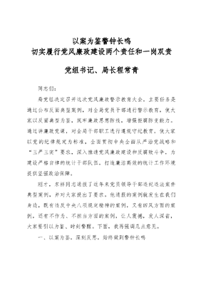 以案为鉴警钟长鸣切实履行党风廉政建设两个责任和一岗双责党组书记、局长程常青同志们:局党组决定召开这次党风廉政警示教育大会,主要任务是通过公布反面典型案例,对全局党员干部进行警示教育,使大家以反面典型为鉴,筑牢廉政思想防线,增强拒腐防变能力。通过讲廉政党课,对全局干部职工进行遵规守纪教育,使大家以党的纪律规定为标准,全面贯彻中央全面从严治党战略和三严三实要求,深入推进党风廉政建设和反腐败斗争,为建设严格自律的统计干部队伍,打造廉洁高效的统计工作环境提供坚强政治保障。刚才,东祥同志通报了近年来党员领导干部违纪违法案件典型案例,并对大家提出了要求。他通报的案例就发生在我们身边,既有违反中央八项规定精神的案例,又有四风方面的案例,还有不作为、不担当方面的案例,让人震撼,发人深省,大家要引以为鉴、时刻警醒。下面,我再强调几点意见。一、以案为鉴,深刻反思,始终做到警钟长鸣全局党员干部要从东祥同志通报的案例中汲取教训,深刻反思,引以为鉴,决不能重蹈覆辙。从公布的典型案例看,一些党员干部走上违纪违法道路,尽管有多种原因,但最根本的还是理想信念动摇,世界观、人生观、价值观这个总开关出了问题。其中七个方面的深刻教训最值得吸取:信仰动摇是蜕化变质的根本原因,党员干部和公职人员必须把好人生的总开关;无视法纪是堕落犯罪的重要原因,党员干部和公职人员必须切实增强法治观念;滥用权力是走向腐败的关键因素,党员干部和公职人员必须树立正确的权力观;贪婪心理是非法敛财的原动力,党员干部和公职人员必须常思贪欲之害;生活腐化是权力腐败的催化剂,党员干部和公职人员必须严肃生活作风;交友不慎是误入歧途的人生陷阱,党员干部和公职人员必须净化社交圈;治家不严是滑向深渊的助推器,党员干部和公职人员必须正确对待亲情。这些案件的教训发人深思,令人警醒。每一名党员干部都要从中吸取教训,引以为戒,切实增强拒腐防变的自觉性和坚定性。在理论上要清醒,自觉用科学理论武装头脑,提高党性修养;在政治上要坚定,坚持对党绝对忠诚的政治品格,严守党的政治纪律和组织纪律,始终在思想上政治上行动上同以习近平同志为总书记的党中央保持高度一致;在经济上要清楚,严格遵守廉政准则和财经纪律,做到公私分明,坚决抵制住各种诱惑和腐蚀;在生活上要清白,培养高尚道德情操和健康生活情趣,自觉践行社会主义核心价值观,自重、自醒、自警、自励,永葆共产党人的蓬勃朝气、昂扬锐气和浩然正气。二、认清形势,深刻领会,把握党风廉政建设新常态当前反腐败斗争形势依然严峻复杂,党风廉政建设和反腐败斗争决不是一阵风,坚持全面从严治党,持续深入推进党风廉政建设和反腐败斗争已成为新常态。党的十八大以来,习近平总书记、李克强总理等中央领导同志多次强调要抓好反腐倡廉工作,先后查处了一批省部级官员。中央先后派出了数十个巡视组赴各省市和国企、高校、金融部门等有关单位开展巡视工作,进一步加大了党内监督力度。今年以来,省、市领导同志多次指出要旗帜鲜明地抓好党风廉政建设和反腐败工作,努力实现干部清正、政府清廉、政治清明。近段时间,省委、市委相继开展了党风廉政警示教育活动。这些都充分表明我们党坚持党要管党、从严治党的信心和决心,表明我们党有腐必反、有贪必肃的信心和决心。也可以看出,中央和省委、市委对廉政建设的要求越来越高,工作越来越严。我们要把思想统一到中央对形势的科学判断上来,深刻领会中央将反腐败斗争进行到底的坚定决心,深入推进党风廉政建设和反腐败斗争。在当前从严治党的新常态下,全局党员干部切不可认为高压反腐是一阵风,坚决克服法不责众的侥幸心理,坚决摒弃明哲保身、不负责任的消极态度,持续拧紧螺丝扣,深入推进党风廉政建设和反腐败斗争,我们见势要早,认识要深,要认真贯彻落实中央和省委、市委的决策部署,切实做到拒腐防变警钟长鸣、反腐倡廉常抓不懈。三、勇于担当,敢于负责,切实履行两个责任党风廉政建设主体责任是党章赋予各级党组织的职责,具体到我局就是局党组、各支部、各主管局长、各处室负责人负主体责任,党组书记是市局落实主体责任第一责任人,各主管领导是所分管处室党风廉政建设主体责任的第一责任人,各部门负责人、各支部书记是本处室、本支部党风廉政建设主体责任的第一责任人,各位班子成员、各部门负责人、各支部书记都承担着一岗双责的任务,都承担着党风廉政建设主体责任,要牢固树立党委抓好党风廉政建设是本职,不抓党风廉政建设是失职,抓不好党风廉政建设是渎职的意识,当好党风廉政建设领导者、执行者、推动者。驻局纪检监察机构要在市纪委和局党组的领导下,切实履行监督、执纪、问责职能,加大对违纪违规问题的查处,履行好监督责任。要切实选好人用对人,严格教育人管理人,敢于处理人问责人,对不讲规矩、不守纪律,不廉政、不勤政,不作为、乱作为的要坚决查处。要持续把主体责任压力逐级