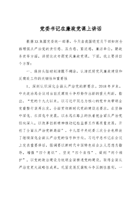 党委书记在廉政党课上讲话根据XX集团党委统一部署,今天由我围绕党员干部如何全面增强从严治党的责任感、压力感、紧迫感,廉洁奉公,勤政务实等方面,讲授这次专题党风廉政党课,下面,我主要讲四个方面:一、保持头脑时刻清醒不糊涂,认清抓好党风廉政建设和反腐败工作的关键性和重要性1、深刻认识深化全面从严治党的新要求。2018年岁末,中央政治局会议对当前反腐败斗争形势作出新的重大判断,指出,党的十九大以来,以习近平同志为核心的党中央带领全党重整行装再出发,全面贯彻新时代党的建设总要求,在坚持中深化、在深化中发展,以永远在路上的执着把全面从严治党引向深入,以改革创新精神推动纪检监察工作高质量发展,开创了全面从严治党新局面。十九届中央纪委三次全会也释放了继续深化全面从严治党的信号和方向。习近平总书记在会议上发表重要讲话,强调要以新时代中国特色社会主义思想为指导,增强四个意识、坚定四个自信、做到两个维护,以党的政治建设为统领全面推进党的建设,取得全面从严治党更大战略性成果,巩固发展反腐败斗争压倒性胜利,一体推进不敢腐、不能腐、不想腐,健全党和国家监督体系,确保党的十九大精神和党中央重大决策部署坚决贯彻落实到位,以优异成绩庆祝中华人民共和国成立70周年。从形成压倒性态势到取得压倒性胜利,一词之变折射出全面从严治党新的重大成果。2、深刻吸取近期一些腐败案例的教训。一年多来,中央纪委国家监委打虎拍蝇猎狐多管齐下。严明党的政治纪律和政治规矩,坚决肃清孙政才恶劣影响,严肃查处鲁炜等对党不忠诚不老实的两面派、两面人;坚持从政治纪律查起,彻底查处秦岭北麓西安境内违建别墅整而未治、阳奉阴违的问题。深入调查督办湖南洞庭湖违规违法建设矮围、京津冀违建大棚房、长春长生公司问题疫苗等背后的责任问题、腐败问题、作风问题。各级纪检监察机关共立案审查存在违反政治纪律行为案件2.7万件,处分2.5万人。健全作风建设长效机制,督促推动中央有关职能部门完善公务接待、公务差旅、公务用车等规定。公开通报曝光7批50起典型案例,查处相关问题6.5万起,处理党员干部9.2万人,坚决防止四风反弹回潮。2019年1月6日,中国科协党组成员、书记处书记陈刚涉嫌严重违纪违法,接受中央纪委国家监委纪律审查和监察调查,成为新年落马的首虎。先后又有中国煤炭科工集团有限公司原党委书记、董事长王金华,国家发展和改革委员会原党组成员、副主任,国家能源局原党组书记、局长努尔·白克力严重违纪违法被双开,陕西省委原书记赵正永,国家烟草专卖局党组成员、副局长赵洪顺,中信集团原党委委员、执行董事赵景文,原国家质量监督检验检疫总局副局长魏传忠接受中央纪委国家监委审查调查。新年再打虎的节奏不变,也表明了反腐败零容忍的态度不变、猛药去疴的决心不减。3、深刻体会古人先贤廉洁自律的苦心。各级管理人员廉洁自律要从小事细节做起,防微杜渐。南宋文学家周紫芝在《竹坡诗话》中记载了一则小故事:北宋时期有位州官,为人极其廉洁。一天晚上,有人从京城送来一封上司的来信。他猜想这必是有什么重要指示,立刻命令公差点上蜡烛阅读。谁知读了一半,他又命令把公家的蜡烛吹灭,把自己买来的蜡烛点上,继续往下看。公差很纳闷,难道公家买的蜡烛不及他自己出钱买的亮吗?问过之后才明白,那封信有小半是关于他留在京城家属的状况,他认为这是私事,不能点公家的蜡烛。在我们看来,为了半封家书,竟然换烛再读,实在有点小题大做。但正是这样的小事,却更能从细节上表现出一个人的品质,更足以让当今存在的公话私打、公车私用、公请私吃、公费私游等等凡此种种揩公家油的一些领导干部汗颜。时时省察,百姓疾苦心永挂;事事检点,为官清贫梦长安。希望在座的各位,能够深刻领会,在工作中履职尽责,老老实实做人,踏踏实实做事,快快乐乐生活。二、落实全面从严治党不含糊,增强抓好党风廉政建设和反腐败工作的责任感和使命感党风廉政建设和反腐败斗争,关系党和国家的生死存亡。党的十八大以来,中央持续保持高压反腐的态势,坚持老虎苍蝇一起打,坚持从严整治四风,形成了从严治党、高压反腐的新形势、新常态。各级组织和广大党员干部一定要增强责任感和使命感,认真学习贯彻中央和上级一系列会议指示精神,以更大的决心和力度,推动党风廉政建设和反腐败工作取得新成效。过去的一年,公司党委深入贯彻中央和上级组织关于党风廉政建设系列会议指示精神,认真落实党委主体责任和纪委监督责任,不断完善教育、制度、监督并重的惩防体系和廉洁风险防控体制机制,为公司负压前行、稳定发展提供了坚强保证,但仍然存在一些问题和不足:一是有的党支部对党风廉政建设责任制重视不够,主体责任落实不力,对党员干部教育管理、监督约束不到位;二是有的单位部门在遵守政治纪律和政治规矩方面打折扣,在落实政策、执行决策上作