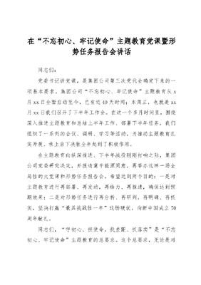 在不忘初心、牢记使命主题教育党课暨形势任务报告会讲话同志们:党委书记讲党课,是集团公司第三次党代会确定下来的一项基本要求。集团公司不忘初心、牢记使命主题教育从x月xx日全面启动至今,已有近40天时间;本周三,也就是xx月xx日我们召开了下半年工作会。在这一个多月时间里,围绕深入推进主题教育和总结上半年工作、部署下半年任务,我们组织了一系列的会议、调研、学习等活动,为推动主题教育扎实开展、承上启下决胜全年起到了积极作用。在主题教育向纵深推进、下半年战役刚刚打响之际,集团公司党委研究决定,并报请冀中能源同意,再举办这样一场全局性的大党课和形势任务报告会,希望达到两个目的:一是对主题教育进行再部署、再发动,再给力、再推进,确保达到预期效果;二是对形势任务进行再分析、再研判,再明确、再抓实,坚决打赢最具挑战性一年这场硬仗,向新中国成立70周年献礼。同志们,守初心、担使命,找差距、抓落实是不忘初心、牢记使命主题教育的总要求。这个总要求,无论是对进一步加强新时代国有企业党建工作,还是对进一步推动我们的转型改革发展战略,都具有很强的现实针对性和战略指导性。因此,今天我就从十二字这个总要求切入,一方面和大家交流一下主题教育开展一个半月来,自己的一些思想体会和实践感受;另一方面和大家探讨一下我们转型改革发展所面临的新形势、新任务,以及下一步要着力抓好的重点工作。下面,讲四个部分的内容。一、践行宗旨守初心何谓宗旨?宗旨是做事的目的和意图;何谓初心?初心是做事的初衷和起因。全心全意为人民服务是我们党的宗旨,为中国人民谋幸福,为中华民族谋复兴是我们党的初心。这个宗旨和这一初心,是我们党流长之源,是我们共产党人立命之本。水无源则竭,木无本而枯。我理解这就是为什么把守初心,放在十二字总要求之首。不忘初心,方得始终。习近平总书记指出:只有回看走过的路、比较别人的路、远眺前行的路,弄清楚我们从哪儿来、往哪儿去,很多问题才能看得深、把得准。七一表彰会上,我和大家一起回望在党的坚强领导下,中国人民走过从站起来到富起来艰苦卓绝的伟大征程,一起感受中国特色社会主义进入新时代,中国人民在党的领导下,迈步强起来新长征,意气风发,众志成城,为我们党的伟大、光荣而钦佩、折服,为自己作为一名共产党员而骄傲、自豪。是党员就要为党竭尽全力工作,就要为人民无怨无悔奉献就要像我们在宣誓时所说的随时准备为党和人民牺牲一切。这句话,我想应该铭刻进我们xx每一名党员的心中,处处提醒自己是一名共产党员,时时唤醒党员要牢记的宗旨和初心。历史是人民书写的,中国共产党的历史是一代又一代、千千万万个践行宗旨、初心的优秀共产党员书写的。总书记在纪念红军长征胜利80周年大会上,讲过的半条被子的故事感人至深、令人难忘,形象地诠释了共产党人的宗旨和初心,告诉我们一个朴素的道理,那就是:平凡孕育伟大,伟大来自平凡。由大及小,你我的宗旨和初心是什么?当然,你要是说党的宗旨和初心就是我的宗旨和初心,那是完全正确的,也是完全应该的,因为我们都是党的一分子。但是,我想我们的宗旨和初心还要是具体的、量化的、可见的。前几天,一位北京来的朋友一连问了我几个问题,他说:你来xx两年多了,最初的感受是什么?最大的感触是什么?最想达到的目标是什么?我是这样回答的,最初的感受是心痛。到任没多久,我去看望了一位老领导。他说,xx真难,职工真苦,老百姓现在都看不起病呀!什么时候想起这句话,我的心都会隐隐作痛。因为,自己作为这一届领导班子的一班之长,如果连这个最起码的民生问题都解决不好,还有什么颜面见我们xx的父老乡亲。最大的感触是我是xx人。去年春节,7天长假我几乎全在办公室,回想半年多与同志们一起摸爬滚打,回想元旦过后去参观文化展厅,眼前像放电影一样,都是大家承压负重的画面。我就想,我们xx虽然暂时困难被动,但我们骨子里不服输、不怕难、不比任何人差,一定会通过努力早日脱困翻身,因为我们是铁骨铮铮的xx人!于是,后来就有了那场以筑梦新时代、我是xx人为主题的纪念建企六十周年文艺演出。最想达到的目标,就是使企业跨上良性发展轨道。记得第一天上任,就是在这个会议室,就在这个台子上,我说:面对新的岗位,我会把责任牢记心中、扛在肩上,与班子成员一起扛起发展xx的重任。这决不是一句台词。因为,发展是解决问题的总钥匙,只有发展才能使xx走出困难的雪山草地、挑战的围追堵截、问题的包围伏击,实现众望所归的稳健运行。只要xx发展了,自己5+2辛苦一些,白加黑多干一点,在所不惜!如果概括一下,我想我的宗旨和初心就是:让xx的每一名职工都有一份工作、有一份收入、有一个安稳的家庭,让企业强起来,让职工富起来。说这些,不是在标榜自我、沽名钓