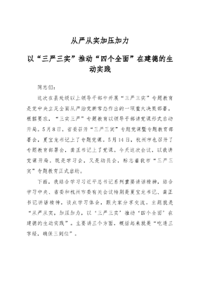从严从实加压加力以三严三实推动四个全面在建德的生动实践同志们:这次在县处级以上领导干部中开展三严三实专题教育是党中央立足全面从严治党新常态作出的一项重大决策部署。根据要求,三实三严专题教育以领导干部讲党课形式启动开局。5月8日,省委召开三严三实专题党课暨专题教育部署会,夏宝龙书记上了专题党课。5月14日,杭州市也召开了专题教育部署会,龚正书记上了党课。今天这次会议,以我讲党课开局,既是学习会,又是动员会,标志着我市三严三实专题教育正式启动。下面,我结合学习习近平总书记系列重要讲话精神,结合学习中央、省委和杭州市委有关会议特别是夏宝龙书记、龚正书记讲话精神,谈点学习体会,跟大家分享交流。主题就是从严从实,加压加力,以三严三实推动四个全面在建德的生动实践。主要讲三个方面,概括起来就是吃透三字经,确保三到位。第一个方面,吃透一个深字,也就是精神领会要深,确保思想认识到位学习三严三实,践行三严三实,必须把思想和行动统一到中央、省委和杭州市委的部署要求上来,搞清楚学什么、为什么学、怎么学,切实增强思想自觉和行动自觉。1.从三个层面抓精神领会,明白学什么。这三个层面,就是要准确把握三严三实的基本内涵、精神实质和实践要求。去年3月9日,习近平总书记在参加十二届全国人大二次会议安徽代表团审议时,明确提出三严三实的要求,强调党员干部特别是各级领导干部要严以修身、严以用权、严以律己,谋事要实、创业要实、做人要实。在去年10月8日教育实践活动总结大会上,习近平总书记进一步指出,三严三实要求是共产党人最基本的政治品格和做人准则,也是党员干部的修身之本、为政之道、成事之要。严以修身,就是要加强党性修养,坚定理想信念,提升道德境界,追求高尚情操,自觉远离低级趣味,自觉抵制歪风邪气。严以用权,就是要坚持用权为民,按规则、按制度行使权力,把权力关进制度的笼子,任何时候都不搞特权、不以权谋私。严以律己,就是要心存敬畏、手握戒尺,慎独慎微、勤于自省,遵守党纪国法,做到为政清廉。谋事要实,就是要从实际出发谋划事业和工作,使点子、政策、方案符合实际情况、符合客观规律、符合科学精神,不好高骛远,不脱离实际。创业要实,就是要脚踏实地、真抓实干,敢于担当责任,勇于直面矛盾,善于解决问题,努力创造出经得起实践、人民、历史检验的业绩。做人要实,就是要对党、对组织、对人民、对同志忠诚老实,做老实人、说老实话、干老实事,襟怀坦白,公道正派。三严三实不是彼此孤立的,而是一个相互联系的有机整体。三严是内在要求,指向是主观世界的改造,做到了三严,三实就有了坚实基础。三实是行为取向,指向是客观世界的改造,做到了三实,三严的实际价值才得以体现。三严三实既有思想要求又有实践标准,体现了世界观和方法论的有机统一、知和行的有机统一、内在规律和外在约束的有机统一。对三严三实,我们必须全面而不是片面地、联系而不是孤立地理解和把握。2.从三个认识抓精神领会,明白为什么学。三严三实总共24个字,但涵盖了修身用权律己,谋事创业做人等多个方面,是对加强思想政治建设和作风建设的深邃思考和科学概括,是新形势下全面从严治党思想的高度凝练,也是全面实施四个全面战略布局的重要保障。第一个认识,就是我们要深刻认识到,开展三严三实专题教育,是弘扬党的优良传统、贯彻党的思想路线的集中体现。纵观我们党的历史,中国共产党之所以能由小到大、由弱变强、由革命党成为执政党,从根本上讲,就是始终保持了严的精神和实的态度。改革开放30多年以来,历届中央领导集体坚定贯彻党的实事求是思想路线,不断赋予解放思想、与时俱进、求真务实的新内涵。特别是新一届中央领导集体,更是把从严从实作为治国理政的新理念,树立了新气象、开辟了新局面,三严三实就是这一理念的集中体现。第二个认识,就是我们要深刻认识到,开展三严三实专题教育,是深化教育实践活动、持续深入推进作风建设的具体行动。对于中央实施八项规定取得的成效,对于群众路线教育实践活动带来的新气象新变化,社会各界是充分认可、高度赞扬的。但是也要清醒看到,作风建设永远在路上、永远没有休止符。现在,广大干部群众最担心的是问题反弹,最盼望的是形成常态化。开展三严三实专题教育,就是在抓常、抓细、抓长上下功夫,以锲而不舍、驰而不息的决心和毅力,把作风建设不断引向深入,使作风建设要求真正落地生根。第三个认识,就是我们要深刻认识到,开展三严三实专题教育,是落实四个全面战略布局、促进建德加快发展的重要保证。落实四个全面战略布局,是当前和今后一个时期的重要政治任务。毛主席说过,政治路线确定以后,干部就是决定因素。落实四个全面战略布局,最重要的是靠严明纪律、优良作风