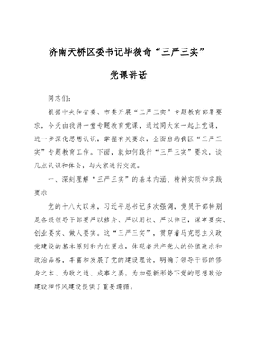 济南天桥区委书记毕筱奇三严三实党课讲话同志们:根据中央和省委、市委开展三严三实专题教育部署要求,今天由我讲一堂专题教育党课,通过同大家一起上党课,进一步深化思想认识,掌握有关要求,全面启动我区三严三实专题教育工作。下面,就如何践行三严三实要求,谈几点认识和体会,与大家进行交流。一、深刻理解三严三实的基本内涵、精神实质和实践要求党的十八大以来,习近平总书记多次强调,党员干部特别是各级领导干部要严以修身、严以用权、严以律己,谋事要实、创业要实、做人要实。这三严三实,贯穿着马克思主义政党建设的基本原则和内在要求,体现着共产党人的价值追求和政治品格,丰富和发展了党的建设理论,明确了领导干部的修身之本、为政之道、成事之要,为加强新形势下党的思想政治建设和作风建设提供了重要遵循。开展三严三实专题教育,是党的群众路线教育实践活动的延展深化,是持续深入推进党的思想政治建设和作风建设的重要举措,是严肃党内政治生活、严明党的政治纪律和政治规矩的重要抓手。从深化作风建设来看,转作风改作风正处在一个关键点、节骨眼上,必须乘势而上;从守纪律讲规矩、营造良好政治生态来看,进一步明规矩、严纪律、强约束,还要从严上入手、从实处着力;从锻造过硬队伍、推进事业发展来看,也需要大力弘扬严的精神、实的作风。三严三实专题教育有的放矢、指向性强,对于进一步增强党的创造力凝聚力战斗力具有十分重要的现实意义。学习三严三实、践行三严三实,前提是准确把握三严三实的基本内涵、精神实质和实践要求。严以修身,就是要加强党性修养,坚定理想信念,提升道德境界,追求高尚情操,自觉远离低级趣味,自觉抵制歪风邪气。古人将修身作为做人的根本,作为齐家、治国、平天下的基础。今天,共产党员严以修身就要自觉树立坚定的信仰,锤炼坚强的党性,培育高尚的情操。严以修身根本是坚定理想信念。理想信念是共产党人的精神之钙,从严管党治党,首先要坚定理想信念,解决好世界观、人生观、价值观这个总开关问题。要深入学习中国特色社会主义理论体系,深入学习习近平总书记系列重要讲话精神,不断增强三个自信,始终坚守共产党人的精神家园。严以修身核心是加强党性修养。加强党性修养就要大力弘扬党的优良传统,自觉增强党的意识,牢记自己的第一身份是党员、第一职责是为党工作,任何时候都要与党同心同德。严以修身基础是提升道德境界。国无德不兴,人无德不立。要大力弘扬社会主义核心价值观,自觉做社会主义道德的示范者、诚信风尚的引领者、公平正义的维护者,以实际行动彰显共产党人的人格力量。严以用权,就是要坚持用权为民,按规则、按制度行使权力,把权力关进制度的笼子,任何时候都不搞特权、不以权谋私。严以用权要反对特权思想。共产党员永远是劳动人民的普通一员,党员干部作为人民公仆,就要永远牢记权力的来源和归属,始终坚持全心全意为人民服务,始终坚持以人为本、用权为民,一丝一毫都不能私用。严以用权要正确行使权力。既然选择了当干部,就要自觉遵守当干部的规矩,敬畏权力、管好权力、慎用权力,按照法律和制度规定去管权、管事、管人,用程序规范权力、约束权力,防止权力失控、决策失误和行为失范。严以用权要加强对权力运行的制约和监督。党员干部没有与生俱来的权力,也没有不受监督的权力。加强监督是对干部最大的爱护,要增强主动接受监督和依法依规保护监督的意识,自觉置于党和人民的监督之下。严以律己,就是要心存敬畏、手握戒尺,慎独慎微、勤于自省,遵守党纪国法,做到为政清廉。领导干部地位特殊、岗位重要,面对错综复杂的考验和形形色色的诱惑,如果不能自律,就会走上歪路,甚至身败名裂。作为领导干部要常怀敬畏之心、戒惧之意,时时处处严格要求自己,真正做到打铁还需自身硬。严以律己要有自省意识。古人云,吾日三省吾身,共产党人更要注重自我纯洁自我净化。严以律己要有红线意识。时刻警钟长鸣、上紧发条,守住做人底线、分清公私界线。严以律己要有法治意识。要带头学习法律,模范遵守法律,依法办事、依法决策、依法行政,不能行使不该由自己行使的权力,更不能以言代法、以权压法、徇私枉法。谋事要实,就是要从实际出发谋划事业和工作,使点子、政策、方案符合实际情况、符合客观规律、符合科学精神,不好高骛远,不脱离实际。谋事要实,既要解决思想认识问题,也要解决方法能力问题。要加强学习,加快知识更新、优化知识结构、拓宽眼界视野,努力使各项决策体现科学性、把握规律性、富于实效性。要深入调研,深入基层、深入实际,在掌握实情的基础上出主意,在心中有数的情况下拿主张。要民主决策,认真贯彻民主集中制,严格履行民主决策程序,广泛听取意见建议,更好地凝聚各方面的智慧和力量。创业要实,就是要脚踏实地、真抓实干,敢于担当责任,勇于直面矛盾,善于解决问题,努力创造出经得起实践、人民、历史