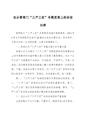 在分管部门三严三实专题党课上的讲话刘萍按照我厅三严三实专题教育实施方案的要求,2015年6月4日刘萍副厅长在厅28楼会议室在分管处室、单位党员、干部当中讲一次专题党课。主要内容摘要如下:一、深刻认识三严三实的重大意义和丰富内涵秦福义厅长在我厅三严三实专题党课和动员部署会议上对专题教育的内涵和重大意义已经做了重要阐述。这次三严三实专题教育不分批次、不划阶段、不设环节,不是一次活动,是在教育实践活动基础上融入经常性教育的一次探索实践。下面,我结合分管工作实际,对三严三实实质和内涵同大家进行一次再学习、再领会,切实提高认识,统一思想。第一、三严三实是持续加强作风建设的必然要求。第二、三严三实是落实全面从严治党的重要内容。第三、三严三实是打造新时期过硬队伍的坚实基础。第四、三严三实是实现全省住房城乡事业新发展的重要保障。二、充分认识不严不实的具体表现和严重危害主要表现以下几个方面:不重学习、眼高手低;安于现状、不思进取;为官不为、不敢担当;疏于管理、搞小圈子;做人不实、弄虚作假。出现以上这些问题,原因是多方面的,既有个人放纵、自我要求不严的问题,也有权力运行存在体制机制漏洞、外在约束不强的原因,还与干部监督管理失之于软、失之于宽都有关系。但深究起来,根源上还是个人理想信念滑坡,宗旨意识淡薄,事业心、责任心不强,官僚主义、形式主义、享乐主义、奢靡之风在作祟,没有真正解决好世界观、人生观、政绩观这个总开关的问题。所有不严不实的问题,如果不高度重视解决,危害极大。对于秦厅长指出六大方面问题和我刚才提到的几方面问题,务必请同志们高度警醒,反躬自省,引以为戒。三、认真落实三严三实的实践要求如何做到三严三实,重点要在以下几个方面下功夫、见行动、求实效。(一)把坚定信仰、对党忠诚作为修身之首。一是把牢政治方向。增强党性立场和政治意识,提高政治敏锐性和政治鉴别力,在大是大非面前头脑清醒、旗帜鲜明,经得起大风大浪考验。二是坚定理想信念。三是对党高度忠诚。(二)把心系群众、甘于奉献作为从政之道。一是树立群众观念、正确理解奉献精神。二是增进群众感情、树立奉献意识。养成乐于奉献的崇高品质,以党的事业为重,将奉献精神上升为自觉追求,全心全意践行为人民服务的宗旨。三是坚持身体力行、为群众排忧解难。(三)把恪尽职守、敢于担当作为成事之要。一是锤炼敢于担当的能力。二是弘扬认真负责的精神。三是树立求真务实的形象。坚持求真务实,就是作风要实、工作要实。(四)把务实落实、改革创新作为谋事之基。一是真抓实干。二是改革创新。三是狠抓落实。(五)把严于律己、清正廉洁作为做人之本。一是始终保持敬畏之心。二是始终坚持从严律己。三是加强权力的制约和监督。大力开展廉政风险防控标准化建设工作,通过建立权力清单、责任清单和负面清单,使每一项权力做到五个一,确保权力在阳光下规范运行。四、扎实开展好三严三实专题教育关于这次专题教育,厅党组提出了具体要求。我厅的专题教育从5月份已经开始正式启动了,我们要准确把握精神实质,紧密结合本职实际,认真开展好三严三实专题教育。重点抓好以下四个方面工作:(一)把握总体要求,确保专题教育扎实有效推进。一是把握教育主题。二是始终突出问题导向。三是认真贯彻从严要求。四是注重讲求教育实效。五是准确把握教育属性。(二)坚持以上率下,充分发挥领导表率作用。坚持领导带头、率先垂范,既是我们推进工作的一条基本经验,也是落实三严三实、加强自身建设的内在要求。带头增强宗旨意识,密切联系群众和服务群众;带头树立正确的权力观,坚持勤政高效和廉洁从政;带头提高精神境界,保持良好的操守和品行。(三)扎实做好四个关键动作,带动专题教育全过程抓实抓到位。一是高质量讲好专题党课。二是高质量组织好专题学习研讨。三是高质量召开专题组织生活会。四是高质量抓好整改落实和立规执纪。立规执纪刚性改,制定有效管用的制度、强化制度的刚性执行,推动践行三严三实常态化、长效化。(四)紧密结合工作实际,切实做到专题教育与日常工作两手抓、两促进。一是民生工程必须完成建设任务。二是加快绿色建筑产业发展。三是干部人事管理再上新台阶。四是规范财务管理。