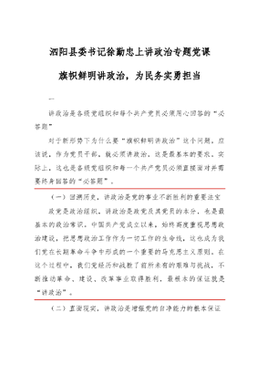 泗阳县委书记徐勤忠上讲政治专题党课旗帜鲜明讲政治,为民务实勇担当一讲政治是各级党组织和每个共产党员必须用心回答的必答题对于新形势下为什么要旗帜鲜明讲政治这个问题,应该说,作为党员干部,就必须讲政治,这是最基本的要求。实际上,这也是各级党组织和每一个共产党员必须直接面对并需要终身回答的必答题。(一)回溯历史,讲政治是党的事业不断胜利的重要法宝政党是政治组织,讲政治是政党及其党员的本分,也是最基本的政治常识。中国共产党成立以来,始终高度重视思想政治建设,把思想政治工作作为一切工作的生命线,这也成为我们党在长期革命斗争中形成的一个重要的马克思主义原则。在这个过程中,我们党经历和战胜了前所未有的艰难与挑战,不断推动革命、建设、改革事业取得胜利,最根本的保证就是讲政治。(二)直面现实,讲政治是增强党的自净能力的根本保证党的十八大以来,以习近平同志为核心的党中央把全面从严治党纳入四个全面战略布局,采取一系列重大举措管党治党,党风廉政建设和反腐败斗争取得显著成效。作为党员干部,只有把讲政治作为立身之本、成事之基,才能确保不犯错误、不走错路,党的肌体才能更加健康,发展事业才有政治保障。队伍是推动事业成功的关键,党建是抓好一切工作的保障。只有让每一个党组织、每一名党员干部在讲政治上严起来、强起来、实起来,才能有效防御病毒、抵御侵蚀,以良好的政治免疫力,营造风清气正的政治生态,保障地方发展的健康可持续。(三)展望未来,讲政治是实现奋斗目标蓝图的必然要求关于今后一个时期的目标任务,党中央提出要坚持五大发展理念,到2020年实现全面建成小康社会的奋斗目标;省委省政府立足全省大局、体现率先要求,提出了以两聚一高引领江苏新发展,并对于宿迁不走老路、探索新路作出了三项任务的部署要求,明确了江苏生态大公园的新定位;市委市政府按照省委要求,提出要推进两聚一高、落实三项任务,加快生态经济示范区建设,走好生态优先、绿色发展的新路;我们也按照省委、市委统一部署,立足泗阳发展实际,提出了建设强富美高全面小康新泗阳的战略目标。只有每一个党组织、每一名党员干部在思想上、政治上、行动上保持一致、同心同德,我们的目标蓝图才会变成美好现实,全面建成小康社会目标才能如期实现。二讲政治是各级党组织和每个共产党员必须精准辨别的是非题旗帜鲜明讲政治需要各级党组织和每一个共产党员都头脑清醒、信念坚定、精准辨别、认真践行,在政治上明辨是与非、对与错,在思想上明辨良与莠、好与坏,在道德上明辨荣与辱、美与丑,始终做到心有所畏、言有所戒、行有所止。一要坚守理想信仰,坚决把正确政治方向摆在首位。山无脊梁要塌方,人无脊梁会垮掉。旗帜鲜明讲政治,就是要有信念、有理想,站稳政治立场,把牢政治方向。实际上,讲政治、有信念也是做四讲四有合格党员第一位的标准。二要把握大局大势,坚决把改革发展稳定抓在手上。这方面,政治能力是第一位的,总书记明确提出了注重提高政治能力的重大命题,对于每个党员干部而言,就是要全面提高把握方向、把握大势、把握全局的能力,保持政治定力、驾驭政治局面、防范政治风险的能力。三要走好群众路线,坚决把增进人民福祉放在心上。民心是最大的政治;政之所兴,在顺民心。实践告诉我们民生问题不仅是社会问题和经济问题,也是一个政治问题,而且是最大的政治。只有始终关注民生、不断改善民生,才能赢得民心、取得支持、获得拥护,才能形成强大的凝聚力向心力。四要强化责任担当,坚决把全面从严治党贯穿始终。讲政治,是一个地方党风、政风、社风的综合体现,其核心是党组织和党员干部的党性问题、觉悟问题。旗帜鲜明讲政治,就是要扛起政治责任,从严履职尽责,切实把全面从严治党贯穿始终。要重点抓好党员和党组织两大关键。三讲政治是各级党组织和每个共产党员必须全力做好的证明题学习党的理论是每一位党员的应尽责任和义务,全县各级党员干部要深入认真学习对于增强党性、提升能力、服务发展的重要性和必要性,积极加强思想政治建设和理论武装,进一步提升理论素养、思维水平和工作本领,为推进两聚一高、落实三项任务提供有力思想政治保证和强大精神动力。以本次专题培训会为标志,我县旗帜鲜明讲政治专题学习培训正式启动。活动开展得如何,成效到底怎么样?这些都是我们要全力去做且必须做好的证明题。全县各级党组织要按照专题学习培训《工作方案》要求,加强组织领导,周密安排部署,确保专题学习培训工作顺利开展、取得实效。