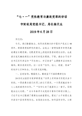 七·一党性教育与廉政党课的讲话市财政局党组书记、局长杨天生2019年6月28日同志们:今天,我们隆重集会,热烈庆祝伟大的中国共产党成立98周年。根据局党组研究的意见,由我上一堂党性教育和党风廉政建设专题党课,这既是贯彻上级组织要求的规定动作,也是落实党风廉政建设主体责任的现实需要。下面,我结合习近平总书记系列讲话和不忘初心、牢记使命主题教育活动相关精神,联系我局实际,谈一谈对信仰、初心、规矩、使命的初步认识和体会,与大家交流共勉。一、坚定信仰,增强定力,锻造坚不可摧的精神支柱20世纪法国哲学家萨特曾说世界上有两样东西是亘古不变的,一是高悬在我们头顶上的日月星辰,一个是深藏在每个人心底的高贵的信仰。信仰认定了就要信上一辈子,否则就会出大问题。在今年春季中央党校中青年干部培训班上,习近平总书记强调了理想信念的重要性,要求广大干部要在真学真信中坚定理想信念,永葆政治本色。如何坚定信仰,立根固本,在这里和大家交流3个问题——为何信仰?信仰为何?信仰何为?(一)为何信仰?——我们为什么要有信仰?信仰,是一种精神,是力量的源泉。一个人没有信仰,将徘徊于人生的道路;一个民族没有信仰,将丧失前进的动力;一个政党没有信仰,将缺少精神的支柱;一个国家没有信仰,将迷失奋斗的方向。小到一个人、一个集体,大到一个政党、一个民族、一个国家,只要有信仰、信念和信心,就会愈挫愈奋、愈战愈勇。无论过去、现在还是将来,对马克思主义的信仰,对中国特色社会主义的信念,对实现中华民族伟大复兴中国梦的信心,都是指引和支撑中国人民站起来、富起来、强起来的强大精神力量。对于共产党员而言,信仰是共产党人安身立命、经受住任何考验的精神支柱。我们知道,党的奋斗目标是实现共产主义,党的根本宗旨是全心全意为人民服务。有了这个信仰,共产党人才能经受住各种考验,在各种政治风浪中才能坚定政治立场,不迷失方向。看看党的好干部,焦裕禄、孔繁森、沈浩、杨善洲、张思德、雷锋等人,他们牢记党全心全意为人民服务的宗旨,以人民满意作为行动的准则,艰苦奋斗,无私奉献,成为我们的楷模。习近平总书记指出,信仰就是共产党人精神上的钙,没有理想信念,理想信念不坚定,精神上就会缺钙,就会得软骨病。只有补足信仰之钙,打好信念之铁,炼出意志之钢,我们方能在新形势下的伟大斗争中赢得主动。有了信仰,才能践行党的根本宗旨,敢于干事创业、积极作为、担当奉献,真正做到爱党、护党,为党的共产主义事业作贡献。反之,缺乏信仰,就如这些年各级纪检监察机关查处的大老虎、小苍蝇,常常为谋一己私利,在权力的漩涡中迷失自我,甚至彻底丧失理想信念,堕落为一名不合格的党员干部,一步一步走上贪腐之路、迈向深渊。对于财政部门而言,信仰是忠实践行党赋予的使命、责任,为党委政府当家理财,推动新时代财政改革发展的内生动力,它激励着一代又一代财政人继往开来、开拓创新,直面困难、矛盾和问题,为地方经济和社会发展提供强有力的财政保障和资金支持。反之,如果缺乏这个信仰或者信仰不坚定,就会回避困难矛盾,守摊度日,制定出来的财政体制、财政政策难以把握引领经济发展新常态,无力推动供给侧结构性改革,无从践行财政为民服务宗旨,更谈不上发挥财政在国家治理中的基础和重要支柱作用。因此,全体财政人要坚定理想信念,强化财务必自觉服从服务于政的意识,切实管好钱袋子,发挥好财政职能作用。(二)信仰为何?——我们的信仰是什么?中国共产党的最高理想是共产主义,这是所有共产党人的共同信仰、最高信仰。这个信仰看似抽象,但却广泛存在,它通过无数生动真实、相互丰满的鲜活事实展现在我们面前。充分认识共产党人的信仰,要努力克服三种误区:1.信仰不是没有抓手。信仰是一种崇高的精神,是一种坚定不移的意识,坚定信仰最终的目标是要落实到行动上来。讲信仰,就要履行党员义务;讲信仰,就是坚持为民立场。听从国家的召唤是信仰,服从组织的安排是信仰,干好本职工作也是信仰。作为一名党员干部,信仰不是抽象得没有抓手,不是讲则有不讲则没有,它应该印在骨子里,刻在潜意识中,自觉以一个党员的标准去为党尽忠、为民尽责就是信仰。就财政部门而言,科学合理为民理财就是信仰。2.信仰不是遥不可及。形容一个人有信仰,有些人总觉得境界高不可攀;讲共产党员有信仰,总觉得必须干了轰轰烈烈的大事。衡量信仰的高低,并不是以做的事情大小为标准。砍头不要紧,只要主义真是信仰,雷锋坚持为民做好事也是信仰,当代活雷锋郭明义开通为民微博也是信仰。在当今时代,一个共产党人的信仰其实很简单,就是看是否心中有党,是否心中有民,对岗位工作的尽职尽责,对人民群众尽心尽力,对自身要求尽善尽美,朴素的事情做多了照样很丰满、很精彩,每个共产党人都可以做到。3.信仰的内涵不是一成不变。党的事业发展不是一片坦途,不断面