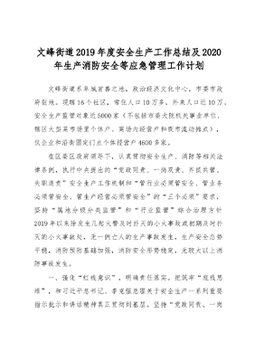 文峰街道2019年度安全生产工作总结及2020年生产消防安全等应急管理工作计划文峰街道系阜城首善之地,政治经济文化中心,市委市政府驻地。现辖16个社区,常住人口10万多,外来人口近10万。安全生产监管对象近5000家(不包括市委大院机关事业单位、辖区大型菜市场里个体户、商场内经营户和夜市流动摊点),仅企业和沿街固定门点个体经营户4600多家。在区委区政府领导下,认真贯彻安全生产、消防等相关法律条例,执行中央提出的党政同责、一岗双责、齐抓共管、失职追责安全生产工作机制和管行业必须管安全、管业务必须管安全、管生产经营必须管安全的三个必须要求,坚持属地分级分类监管和行业监管综合治理方针2019年以来除发生几起火警及时扑灭的小火事故或初期及时扑灭的小火事故处,无一例亡人的生产事故发生,生产安全态势平稳,消防预防基础加强,消防安全形势稳定,无较大以上消防事故发生。一、强化红线意识,明确责任落实。把筑牢底线思维,和习近平总书记、李克强总理关于安全生产一系列重要指示批示和讲话精神真正贯彻到基层。坚持党政同责、一岗双责、齐抓共管、失职追责机制,把消防安全生产及消防安全相关规定与任责任真正落实到基层。按照党政同责、一岗双责、三个必须要求,细划明确了党政班子每一位同志一岗双责安全生产工作职责,以书面形式向每位科级干部提醒抓好行业分管范围内的安全生产工作。与16个社区与相关站所部门签订安全生产目标管理责任制书。年初让辖区3647家个体户,369家企业,98家机关事业单位签订安全生产主体责任承诺书。2019年12月份已让辖区4232家个体户、369家企业,79家机关事业单位签订了2020年度消防安全生产安全主体责任承诺书。要求站所按照三个必须要求,抓好各自行业内的安全生产工作职责,要求社区抓好属地监管排查检查职责。二、开展专项行动,坚持抓好铸安。2019年4月至6月份开展1+6+N安全生产隐患排查集中治理专项行动,7月至12月份继续开展1+6+N铸安行动。专项检查3751家个体户、企业及单位351家,到7457家居民家中开展夏季消防隐患督促排查。并认真开展了防风险、保平安、迎大庆消防安全执法检查活动。对三合一、多合一和六小场所隐患检查场所排查检查。阜王派出所检查整治三合一场所84家,消防处罚12家。沙河派出所2019年对住宿与生产储存经营合用场所下达责令整改通知书200余份,查处消防案件23起,行政拘留11人。清河派出所加强日常消防监督检查,全年消防处罚12家,消防拘留12人。文峰派出所对违规使用明火及锁闭消防门等消防案件20多起,处罚10余人,拘留10余人。办事处对辖区115家重点风险场所和单位建立了防控监管台账,实施了重点监管,对经营储存危险化学品进行了排查,对液化气供应站所进行检查并上报,对交通运输企业和建筑施工单位进行检查,责成社区对所有物业企业进行消防检查,对农民自建房情况逐户进行了排查建档。至11月份风险点单位降低到72家。应急管理站抽查并提醒50多家风险点单位。三、开展风险分类,坚持隐患排查治理。以街巷逐次登记安全监管对象,并根据消防风险大小划分为一二三类不同级别。每月25日至本月底坚持月隐患排查治理制度。全年排查8429家,累计治理隐患205家,已整改204家,整改率达99.5%。在重要节假日,坚持应急值守领导带班制度和检查督查,加强了春节等重要假日关键时节安全工作。2018年12月至2019年1月份,2019年5月至6月份,2019年12月2日至31日,文峰街道安全生产及消防安全进行了三次地毯式大检查大排查大整治。元旦前夕入户检查共计4680家。对检查排查出的50家隐患,实行闭环管理,限期进行整改消除。为压实企业主体责任,在地毯式大检查活动中做到了五有一通知一复查。即有入户检查记录、有企业承诺书、有隐患自查自纠表、有企业负面清章签收、有检查时照片。对有隐患的做到有隐患限期整改通知和复查记录。对758家彩钢板户进行了通知整改或加强管理或自行拆除或不准住人。对飞线充线,在文明创建期间,加强了监督管理,城区14个社区取得了明显成绩。共建177处微型消防站,购置3776个灭火器,为初期火灾提供了物防条件。四、深化安全宣传,加强培训练演。认真开展第十八个全国安全生产宣传月活动。印发1.5万张宣传章,订造了16面签字旗。发放宣传册500本。16个社区全面全展安全生产月活动和消防宣传月活动。社区通过下发宣传单、入户走访、咨询台、电子屏等形式向居民宣传了用电用火、彩钢板房和电瓶车、三合一等消防安全知识。在安居工程和建委大厦小场广,进行了消防应急培训练演。在办事处四楼进行了二次消防安全、安全生产业务知识及逃生技术培训。安全宣传月活动现场在颍州晚报上刊登。五、注重经费投