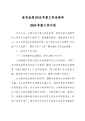 县司法局2019年度工作总结和2020年度工作计划今年以来,全县司法行政工作在县委、县政府的正确领导及上级业务主管部门指导下,紧紧围绕县委、县政府的工作中心,充分发挥司法行政职能优势,深入推进法治X县建设,为实施五大会战、建设四个X县提供强有力的法治保障。一、2019年工作总结(一)全面推进法治建设,提升法制工作水平。1.积极履行县委全面依法治县委员会办公室职责,开展了食品药品监管执法司法工作督查,围绕《法治政府建设实施纲要(2015-2020年)》的贯彻落实,将《纲要》进行细化分解,组织相关部门和队伍自查自评,推进《纲要》的落实。2.发挥政府法制部门的作用,调整充实县政府法律顾问团力量,出台政府购买法律服务实施办法,调动和发挥法律顾问在政府重大决策、依法行政中的咨询作用;认真贯彻落实国务院《重大行政决策程序暂行条例》,对政府重大决策、重要文件,均组织法律专家开展合法性审查出具合法性审查意见,实现应审尽审;推动行政诉讼案件行政首长出庭应诉制度的落实,突破了长期以来我县行政首长出庭应诉案件为零局面。3.配合宣城市对我县食品药品监管执法司法工作开展督查活动。市依法治市办第三督察组一行采取谈话了解和实地暗访形式进行督查,谈话了解分个别谈话、座谈会依次进行。座谈会上督察组通过听取我县食品药品行政执法工作情况汇报,对近三年卷宗材料进行随机抽查等方式深入了解我县食品、药品安全管理情况。此次督查活动,督察组对我县食品药品执法司法工作予以充分肯定。(二)强化法治宣传教育,营造浓厚法治氛围。1.不断健全法治宣传教育体制机制。采取工作任务项目化的方式,印发《X县2019年法治宣传教育工作要点》、《X县法治宣传教育工作领导小组成员单位2019年重要工作目标任务》,梳理发布X部全年重点普法目录,公布谁执法谁普法谁开展法律服务责任清单,明确全年重点普法节点、内容和计划,根据节点开展督查指导,推进落实。2.扎实开展法治家庭创建工作。出台《X县2019年度法治家庭建设活动方案》,将法治家庭建设纳入县政府年度法治宣传教育工作目标管理考核,纳入年度社会治安综合治理目标管理考核和纳入县文明家庭建设考核。创新开展金农法治家庭贷。截止目前已评选X户法治家庭示范户,培育X户法治家庭标兵户,推荐X户作为全市最赞心动法治家庭候选人。3、扎实开展各类法治宣传教育活动。鼓励自创黄梅歌《宪法来护航》,不断推进法治文化建设;开办《法在身边》电视栏目、《以案释法》报纸专栏、《法治在线》短信平台、《泾川普法在线》微信公众号和微博,全媒体加大普法宣传。高标准完成了七五普法中期督查,高标准建设了法治文化广场。(三)抓公共法律服务体系建设,提升法律服务质量全县共计建成公共法律服务中心X个,公共法律服务乡镇工作站X个,公共法律服务村居工作室X个,建立村居法律服务微信群X个,积极为让老百姓打造足不出户即可获得便捷高效的公共法律服务的平台。1.认真组织实施法律援助民生工程。制定《X县城乡困难群体法律援助民生工程实施方案》,建立法律援助民生工程周调度制度,开展法援惠民生、助力农民工法律援助专项活动和法律援助进乡村、进家庭等系列活动,为受援对象提供高标准服务、办理高质量案件,取得高满意度肯定,2019年获评县民生工程实施工作先进单位。截止目前共办理法律援助案件全年法律援助任务数为X件,目前完成X件,任务完成率为X%。2.律师队伍作用发挥成效显著。一是实施律师代理重大敏感案件报告制度和以案释法制度。律师代理重大敏感案件X件,其中涉恶案件X件。开展以案释法X余人次。二是政府法律顾问团依法履职,作用发挥明显,依法审查规范性文件和出具法律意见书X份,参项专项会议X次,处理其他法律事务X件。服务地方经济,积极参与牛岭水库等大型建设项目。三是积极参与接访接待,化解信访案件X件,其中化解疑难复杂矛盾纠纷X件,陪同县领导接访X人次,参与法治讲座X余次,参与送法进企业、法律咨询等活动X余次,受益群众逾X人次。3.创新发展公证工作。积极落实群众最多跑一次工作,建立微信公众号,实现网上咨询和受理。积极投身县委、县政府中心工作,为国有资产处置、保全等事宜提供非诉法律服务。为贫困村扶贫项目提供公证服务。进一步在全县推广绿色继承、家事法律服务。认真办理遗嘱、继承权、证据保全等公证事项,切实保障群众的合法权益,促进社会和谐稳定。开展涉外公证代办业务,积极为群众提供便捷涉外法律服务。截止目前共办理各类公证X件。(四)抓基层基础设施建设,发挥人民调解防线作用。1.建立乡镇专职人民调解员队伍。加强专职人民调解员队伍建设,提请县政府同意,为每个乡镇配备X名专职人民调解员。2.强化行业性专业性人民调解组织建设。增设县旅游纠纷调解委员会和县林业纠纷调解委员会X个行业性专业性人民调解组织