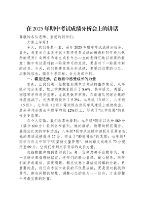 在2025年期中考试成绩分析会上的讲话尊敬的各位老师、亲爱的同学们:大家上午好!今天,我们齐聚一堂,召开2025年期中考试成绩分析会。首先,我要向在本次考试中取得优异成绩的班级和同学表示热烈的祝贺!向所有为学生成长付出心血的老师们致以崇高的敬意!期中考试是对前一阶段学习的总结,更是对下一阶段冲刺的动员。今天,我们既要客观分析成绩,更要以归零的心态、必胜的信念,锚定中考目标,全力发起冲刺。一、看见进步,在数据中感受成长的力量首先,让我们用一组数据回顾本次考试的整体情况。从年级平均分来看,较上学期期末提升了8.6%,其中语文、英语、物理等学科进步显著,尤其是数学学科,在新增几何综合题的难度挑战下,优秀率仍提升了5.2%。九年级(3班)、八年级(5班)、七年级(2班)等班级在班风学风建设上成效突出,总分平均分超出年级平均线12%以上,形成了"比学赶超"的良性竞争氛围。在个人层面,我们欣喜地看到:九年级*同学以总分589分(满分600分)位列全市前列,她的数学、物理均斩获满分,展现出扎实的学科功底;八年级*同学从班级中游跃升至第8名,他的英语成绩提升27分,印证了"勤能补拙"的真理;七年级*同学在作文中写下"用坚持丈量梦想",她的语文成绩从72分提升至89分,让我们看到文字背后的成长力量。这些数据和案例告诉我们:每一份努力都不会被辜负,每一点进步都值得被铭记。老师们的精心备课、耐心辅导,同