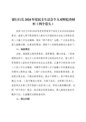 银行行长2024年度民主生活会个人对照检查材料(四个带头).docx