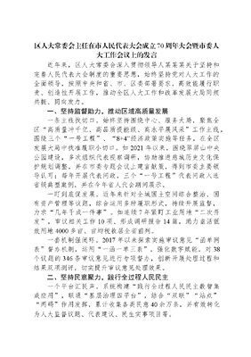 区人大常委会主任在市人民代表大会成立70周年大会暨市委人大工作会议上的发言.docx