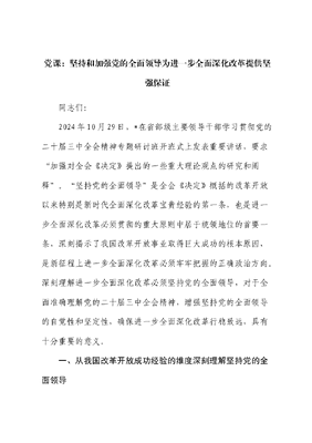 党课:坚持和加强党的全面领导 为进一步全面深化改革提供坚强保证(省部级三中精神).docx