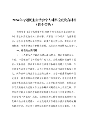 2024年专题民主生活会个人对照检查发言材料(四个带头).docx