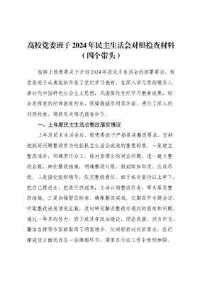 高校党委班子2024年民主生活会对照检查材料(四个带头).docx