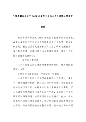 X常务副市长关于 2024 年度民主生活会个人对照检视发言材料.docx