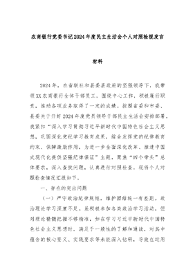 农商银行党委书记2024年度民主生活会个人对照检视发言材料.docx