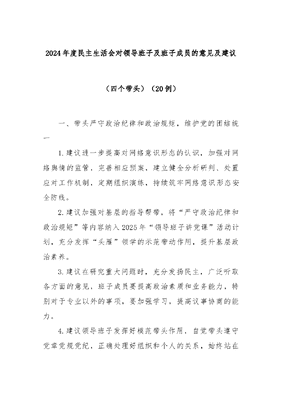 2024年度民主生活会对领导班子及班子成员的意见及建议20例(四个带头).docx