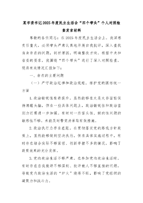 某市委书记2025年度民主生活会“四个带头”个人对照检查发言材料.docx