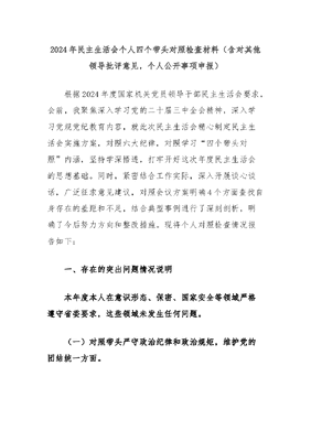 2024年民主生活会个人四个带头对照检查材料(含对其他领导批评意见,个人公开事项申报).docx