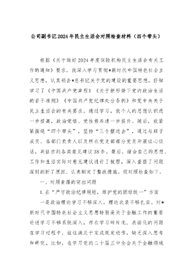 公司副书记2024年民主生活会对照检查材料(四个带头).docx