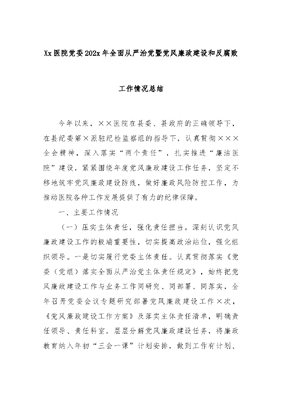 Xx医院党委202x年全面从严治党暨党风廉政建设和反腐败工作情况总结.docx