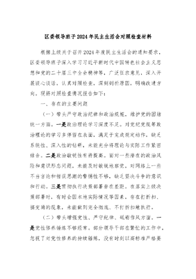 2024年机关党员领导干部民主生活会、组织生活会批评与自我批评意见.docx