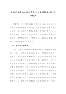 市直单位领导2024年度专题民主生活会对照检查材料(四个带头).docx
