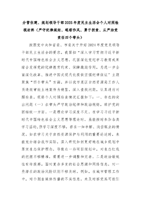 分管住建、 规划领导干部 2025 年度民主生活会个人对照检视材料(严守纪律规矩、 砥砺作风、 勇于担责、 从严治党责任四个带头).docx