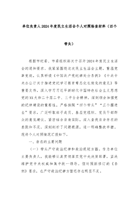 单位负责人2024年度民主生活会个人对照检查材料(四个带头).docx
