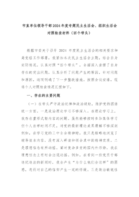 市直单位领导干部2024年度专题民主生活会、组织生活会对照检查材料(四个带头).docx