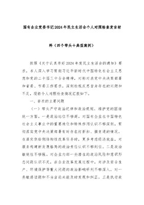国有企业党委书记2024年民主生活会个人对照检查发言材料(四个带头+典型案例).docx