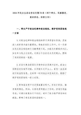 2024年民主生活会存在问题70条(四个带头、巡察整改、意识形态、保密工作).docx
